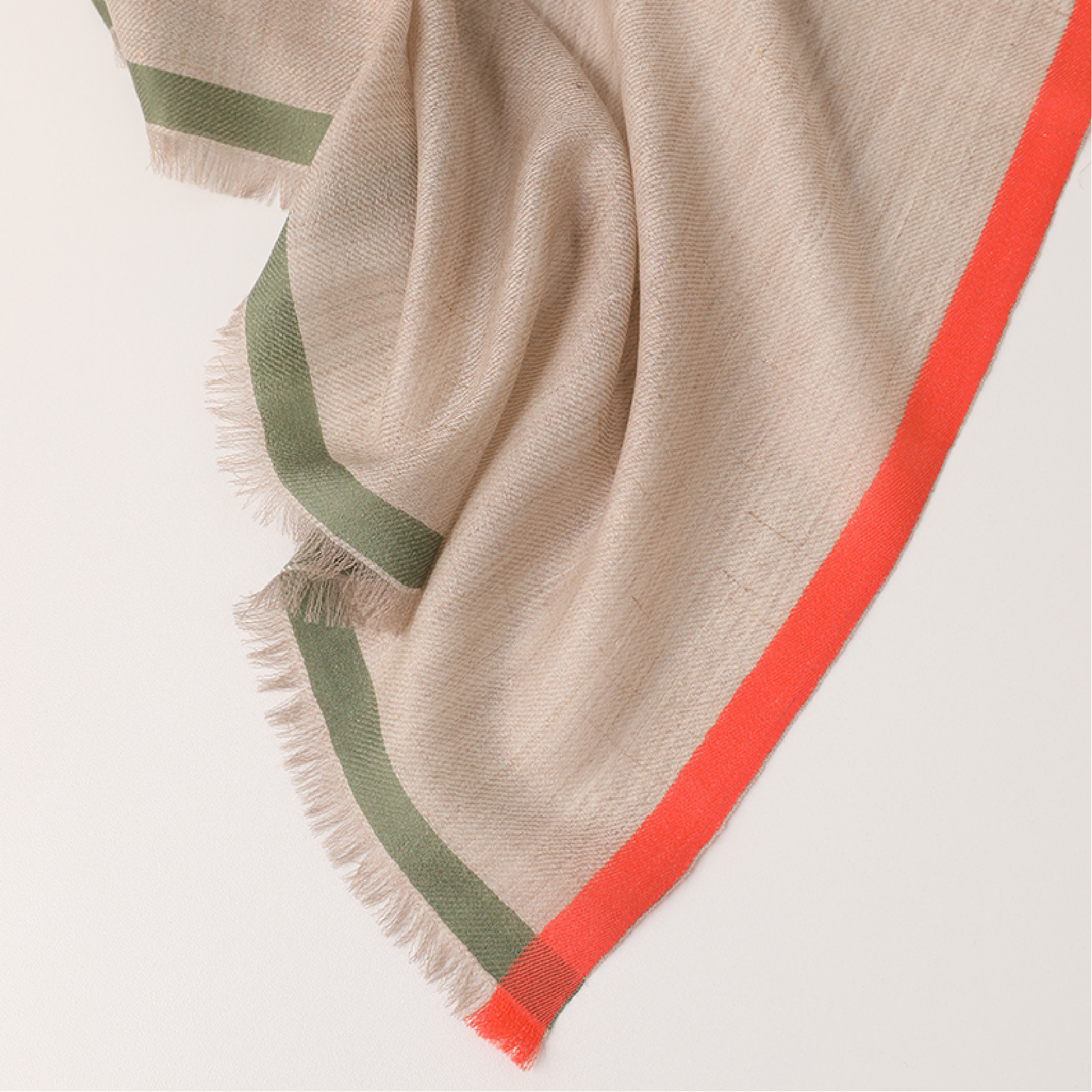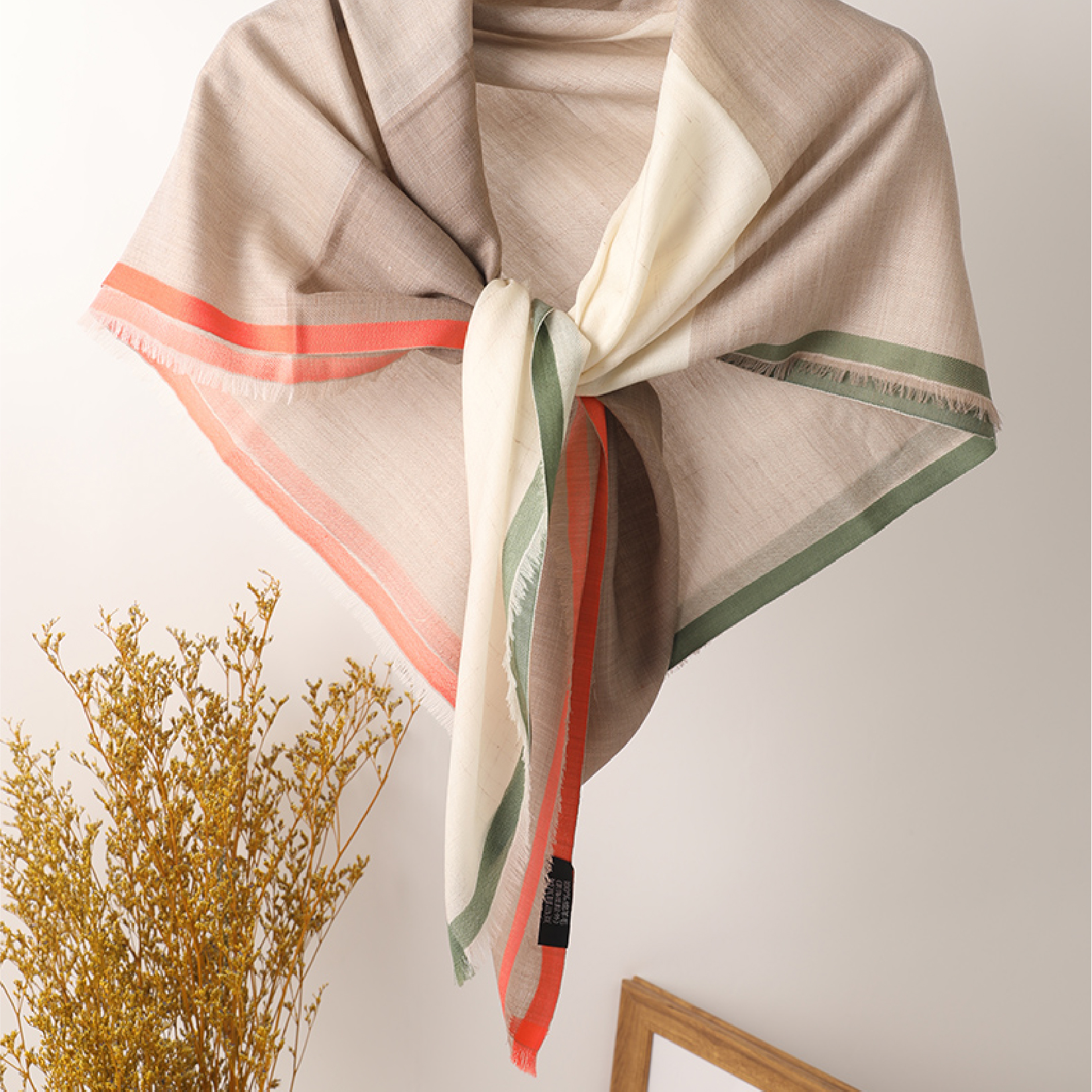 . 羊毛極佳的透氣性及保暖性,保持身體乾燥舒適感,適合四季使用 . 方巾不同綁法,為穿搭增添搭配性 . 彩邊線條設計,讓造型更有亮點 . 100%羊毛 .110 x 110 cm